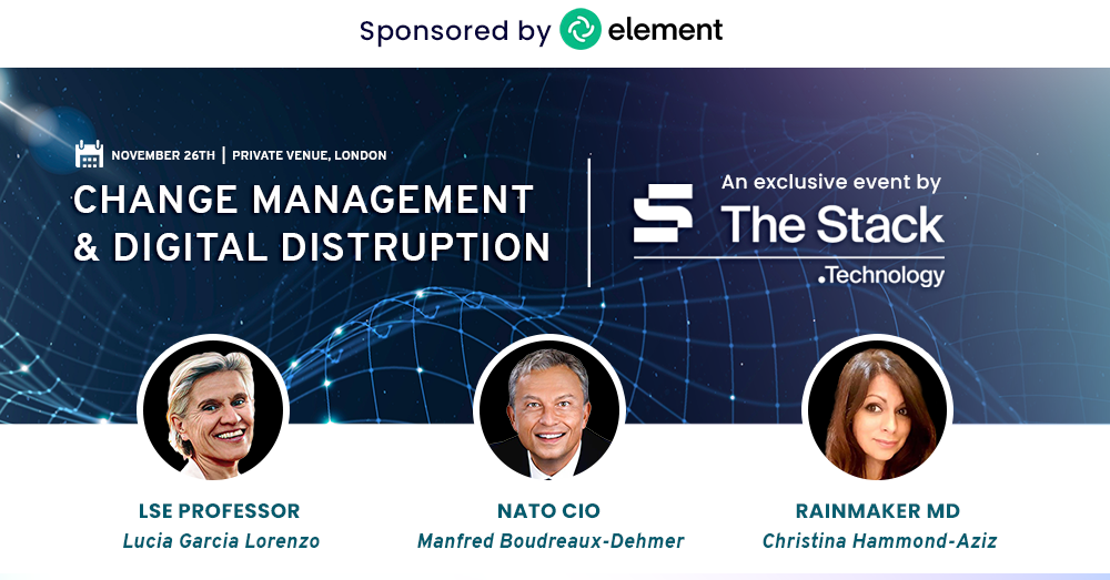 At our exclusive event on November 26, sponsored by Element, an invitation-only audience of 25 leading CIOs and IT leaders will join new NATO CIO Manfred Boudreaux-Dehmer, LSE Professor Dr Lucia Garcia Lorenzo and Rainmaker Managing Director Christina Hammond-Aziz for an intimate dinner and panel discussion on change management – hosted by The Stack’s founder Edward Targett at a private members’ club in central London.