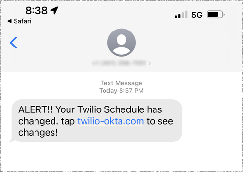 Typical text bodies suggested that the employee's passwords had expired, or that their schedule had changed, and directed them to malicious URLs that included words like "Twilio," "Okta," and "SSO" to try and trick users to click on a link taking them to a landing page that impersonated Twilio’s sign-in page.