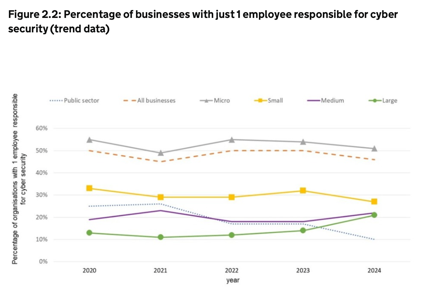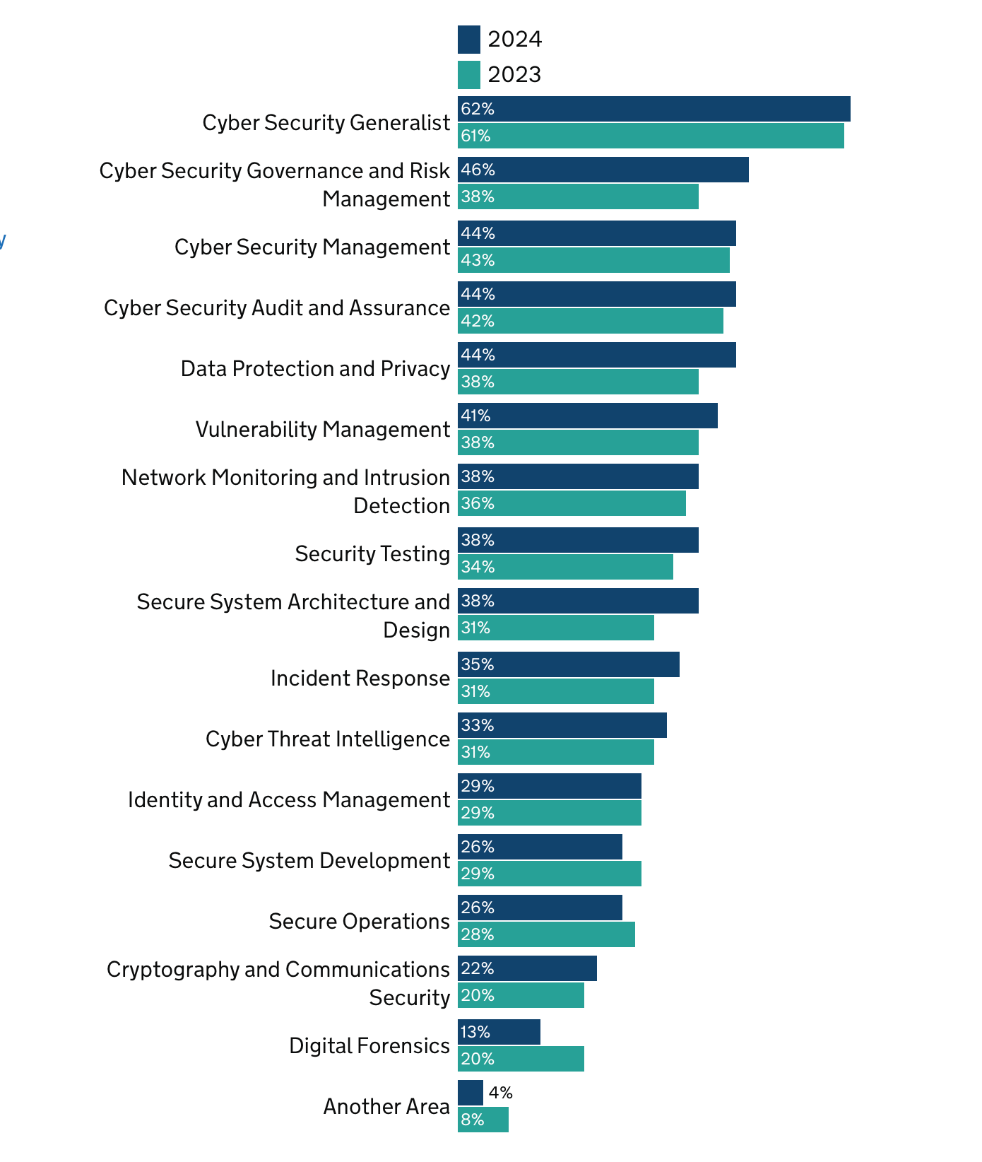 The government also estimate that 30% of "cyber firms" faced a "problem" with a technical skills gap in 2024, which is lower than in 2023 (49%). It celebrated "a significant decline in reported skills gaps across many areas" such as security testing which dropped from 35% to 23%. Conversely, the skills gap for cryptography and communication security has doubled from 12% to 24%.