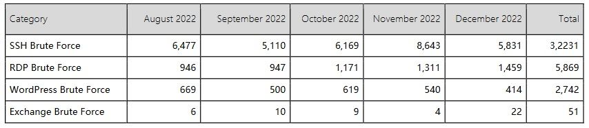 The NCSC honeypots identified over 32,000 SSH brute force attack attempts over the last five months of 2022 and over 5,800 RDP attacks.