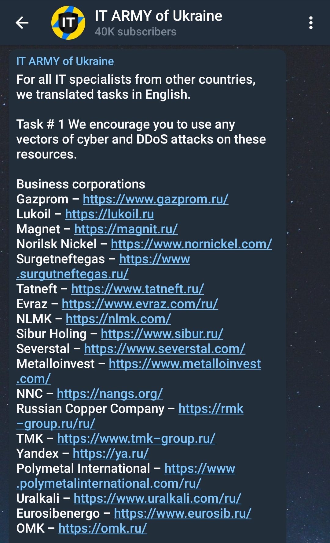 “For all IT specialists from other countries…. Task # 1 We encourage you to use any vectors of cyber and DDoS attacks on these resources,” the Ukraine IT Army page said, naming 31 Russian organisations.