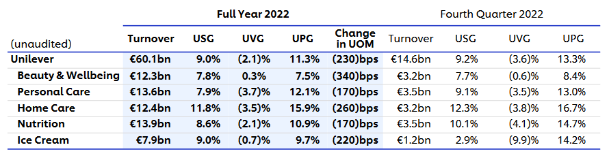 Jope, who retires at the end of 2023, was reporting the company's Q4 and FY earnings. (Unilever operates in over 190 countries and regions. It has over 400 brands, of which 13 generate over €1 billion annually. Some of its best known brands include Ben and Jerry's, Comfort, Dove, Hellmann's, Magnum, and Vaseline.)