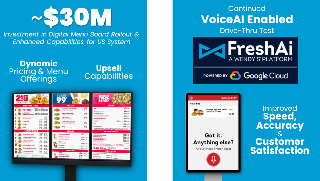 Wendy’s spend a further $15 million this year on its application and $20 million on adaptive digital menus for fluid and AI-led pricing strategies. It is also testing AI voice bots to take orders at drive-throughs.