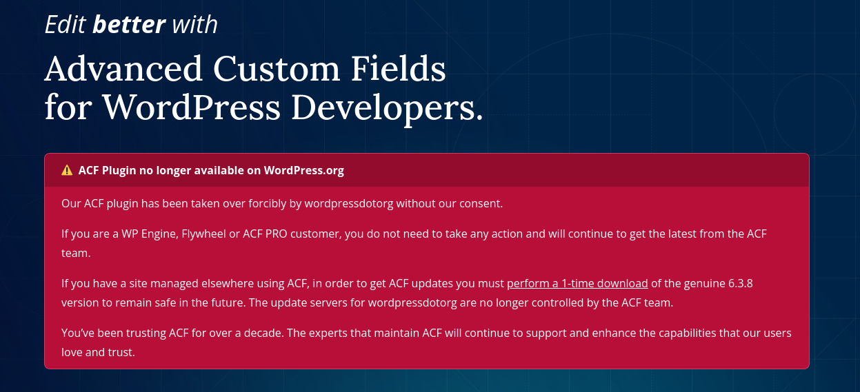 As the ACF team put it: “The change to our published distribution, and under our ‘slug’ which uniquely identifies the ACF plugin and code that our users trust in the WordPress.org plugin repository, is inconsistent with open source values and principles. The change… is maliciously being used to update millions of existing installations of ACF with code that is unapproved and untrusted by the Advanced Custom Fields team.”