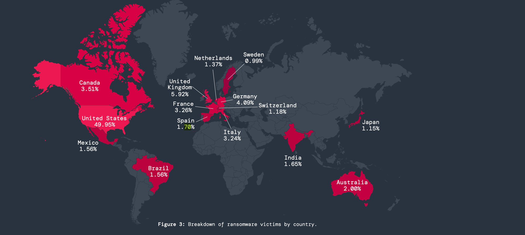 The most targeted countries for ransomware attacks are the United States, with 49.95% of incidents, followed by the United Kingdom at 5.92%, Germany at 4.09%, Canada at 3.51%, and France at 3.26%.